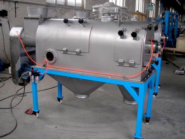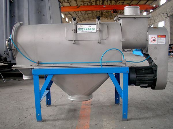 物料由螺旋輸送進(jìn)入圓桶狀篩網(wǎng)內(nèi),由旋轉(zhuǎn)的葉片使物料分散成霧狀,在旋轉(zhuǎn)前進(jìn)中細(xì)料受到離心力和推進(jìn)力作用通過篩網(wǎng),由細(xì)料排出口排出,不能過網(wǎng)的物料逐步推進(jìn)到篩網(wǎng)端部的粗料排出口排出。